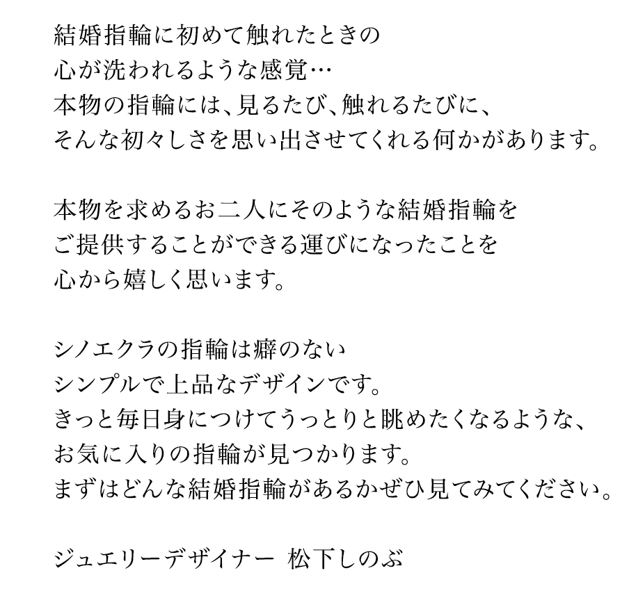シノエクラは世界的ジュエリーコンテストで多くの受賞歴*のあるデザイナーのブランド。 世界が認めるデザイナーだからこそ取り扱える指輪をご提供します(この結婚指輪を取り扱っているのは日本でシノエクラだけ)。